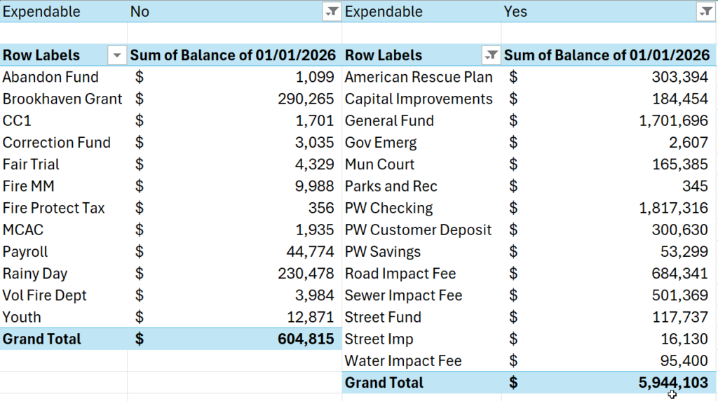 Chaotic accounting does not fix itself overnight and transparency does not return unless someone works on it. I am thankful for the staff that is working diligently to help bring order to the chaos. And we are close. Here is what I am providing the Council at each meeting, and I will only provide more as we get the data into a reportable format. The Left are accounts that we cannot use for regular expenses, and the right side is liquid.