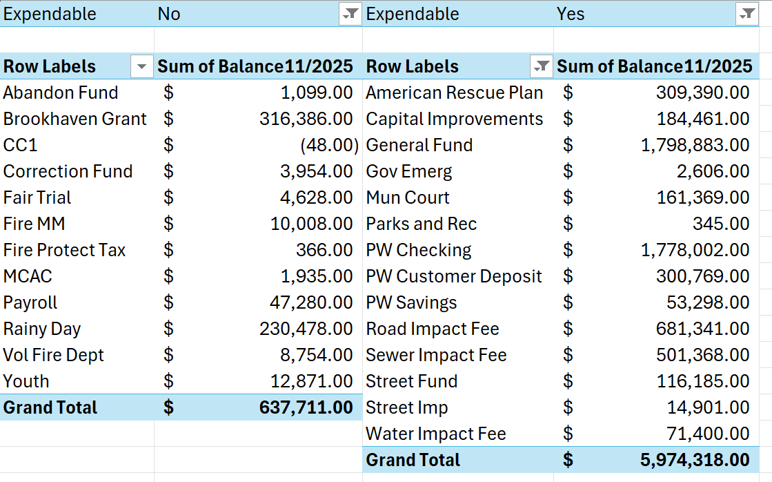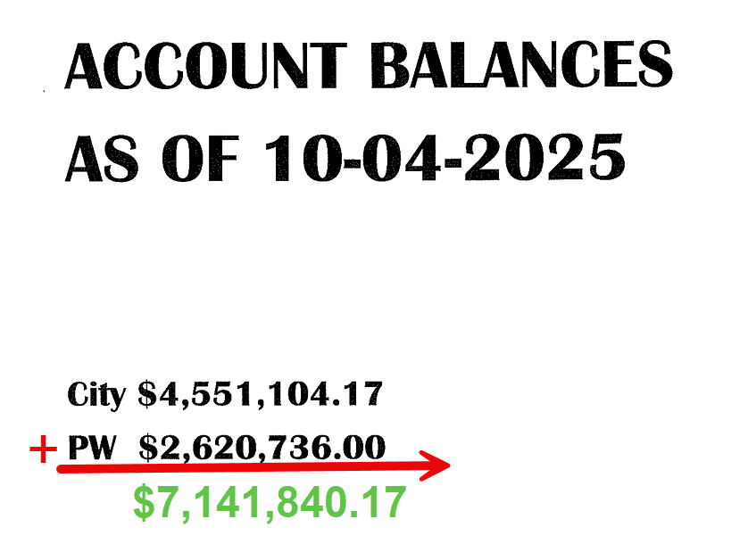 Correction about the $7.1 million balance that I repeated at my first council meeting. That was the last number I received in my council package before being sworn in. I have since discovered that the Water & Sewer Impact fees were double counted and the Sewer Impact fee is $501,368, and the Water Impact fee account balance is $71,400. These bank accounts show under the General Fund and Public Works Bank Account Logins on the bank website, ergo, the actual balance is around $6.5 million. This is just another example of why we should use system generated reporting, not manually typed figures.